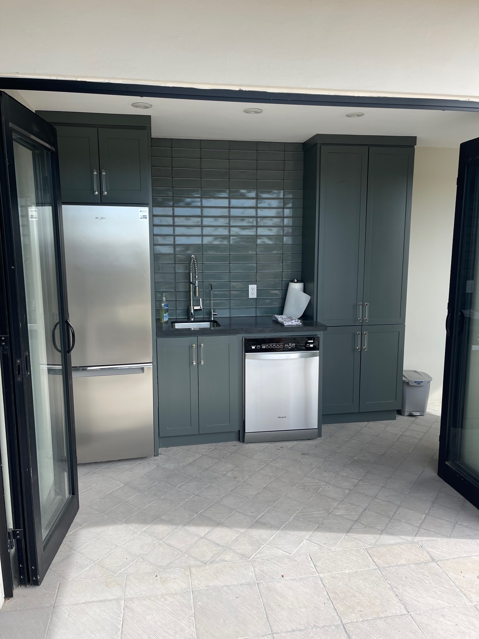 There is a built-in grill bar with four undercounter stools and a fire pit surrounded by designer outdoor furniture, as well as a large dining room table with seating. There are also separate areas for two chaise loungers with an umbrella, a half-bath, and an outdoor shower.