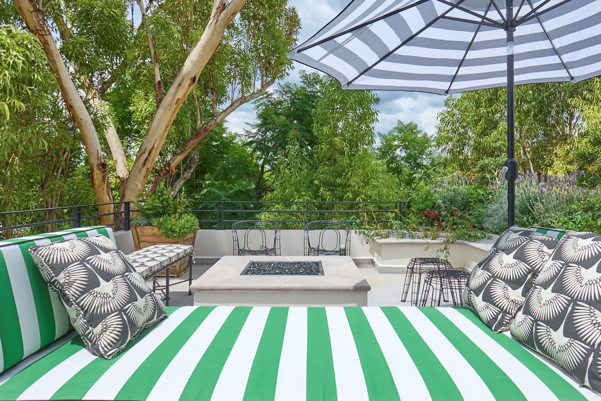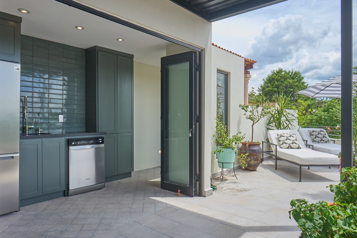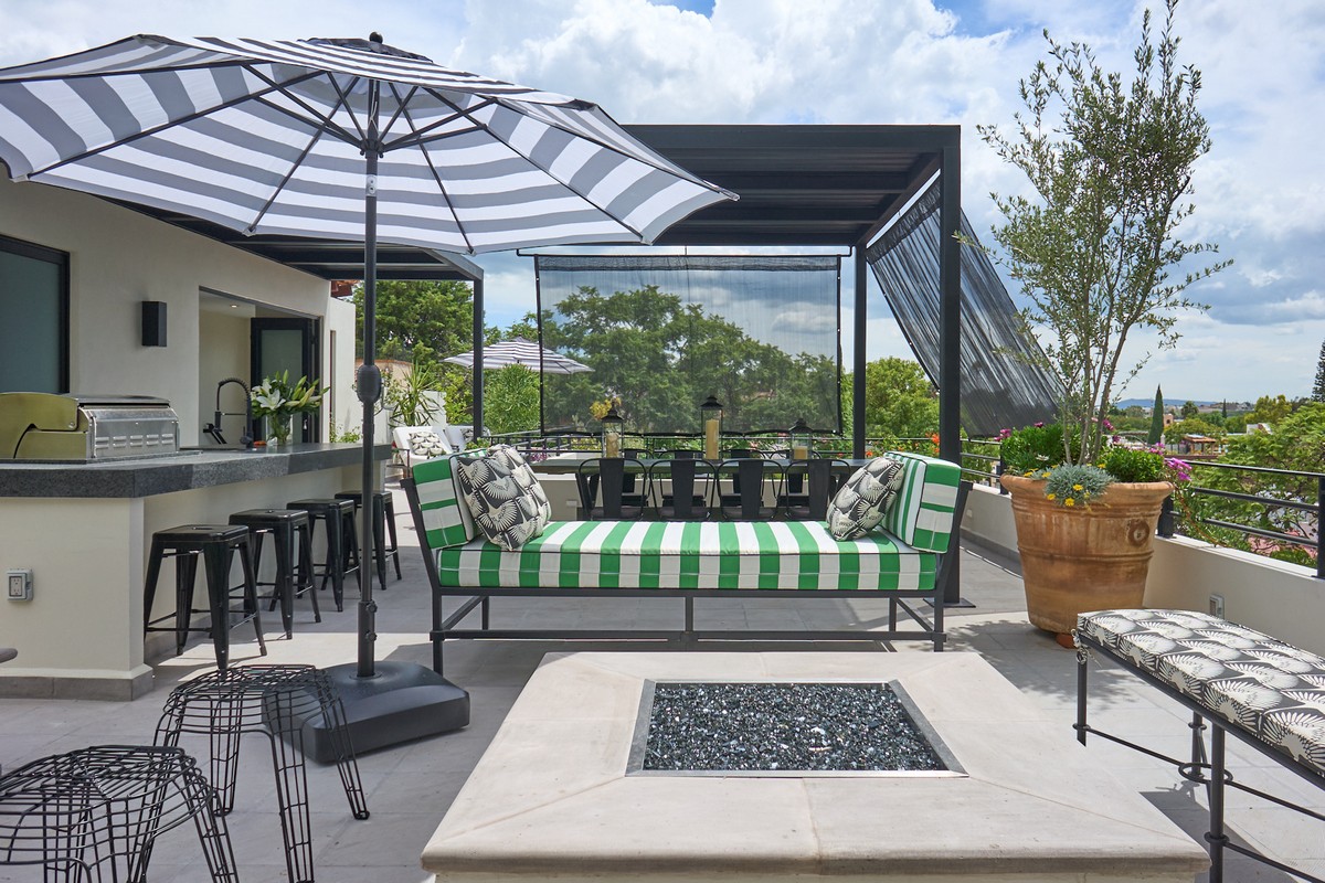 There is a built-in grill bar with six undercounter stools and a firepit surrounded by designer outdoor furniture, as well as a large dining room table with seating. There are also separate areas for two chaise loungers and umbrella, a half-bath and an outdoor shower.