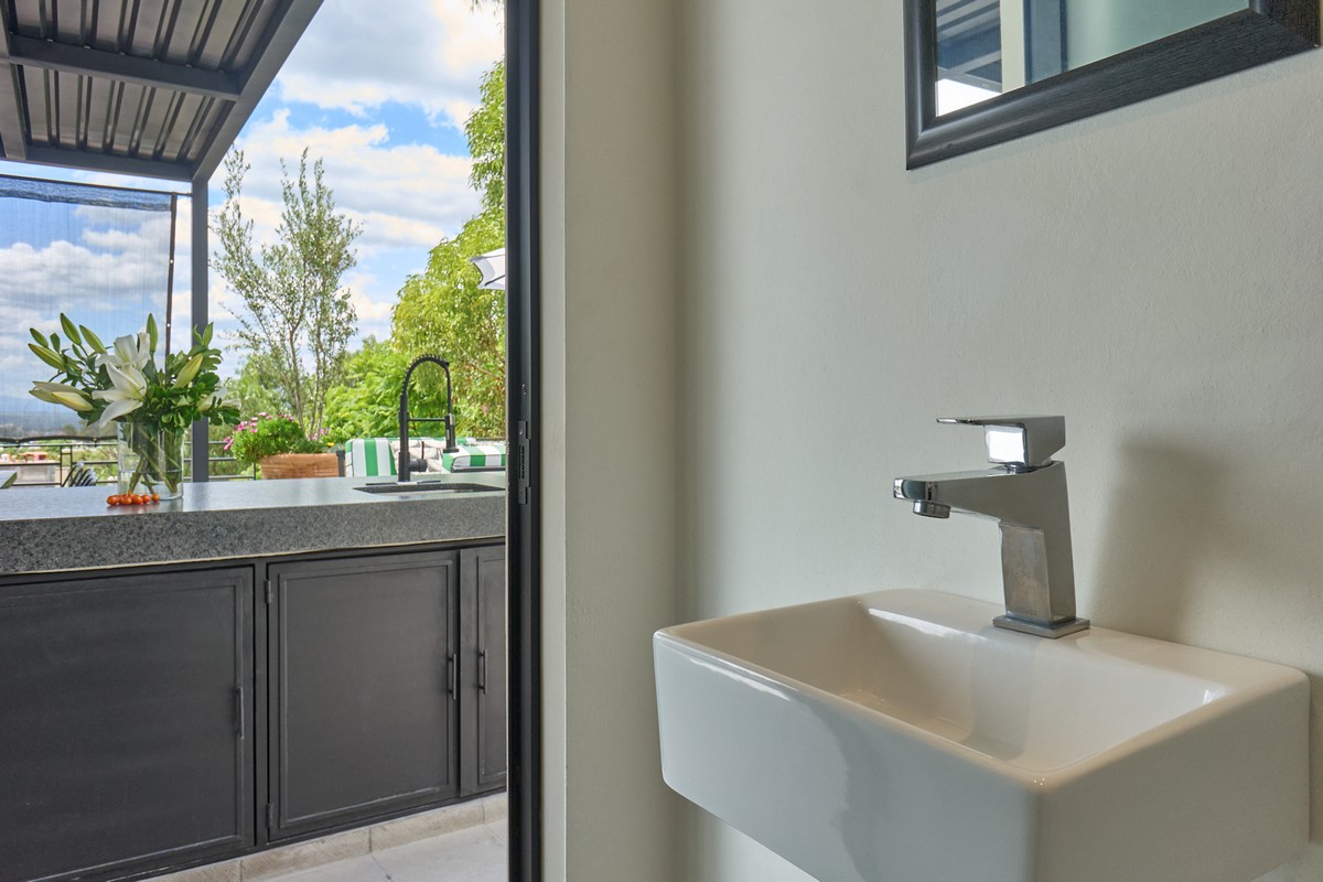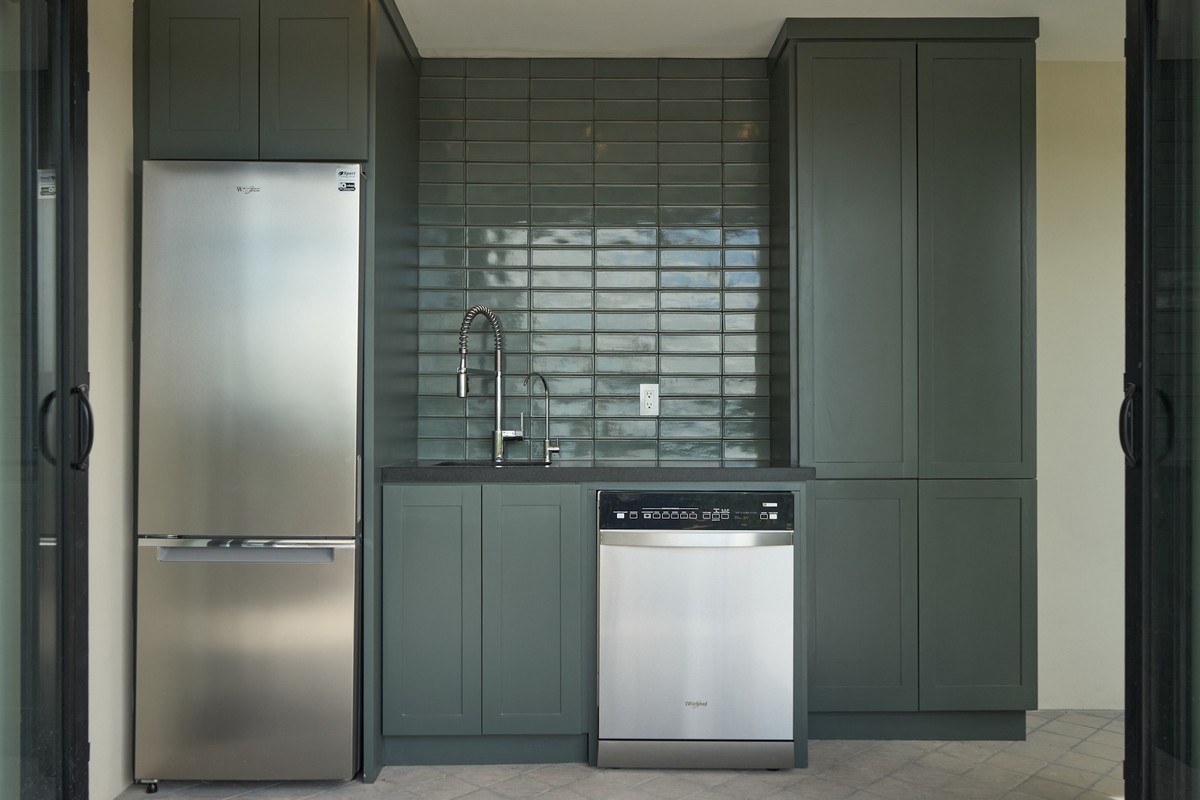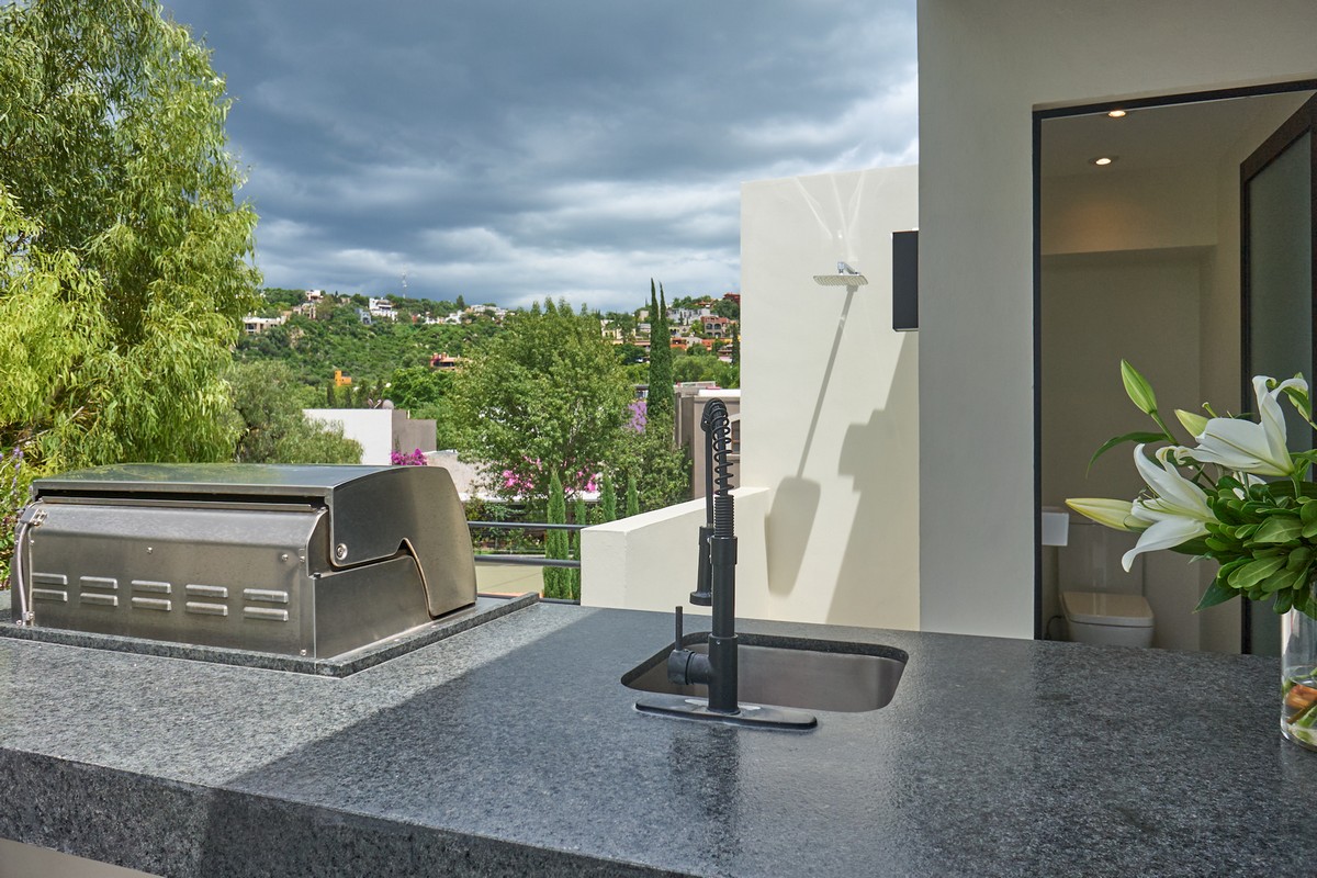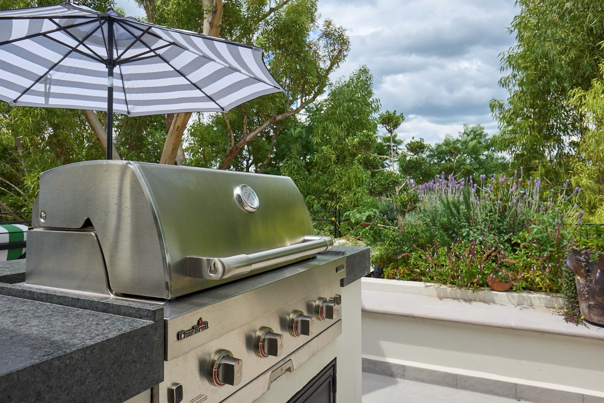 There is a built-in grill bar with six undercounter stools and a firepit surrounded by designer outdoor furniture, as well as a large dining room table with seating. There are also separate areas for two chaise loungers and umbrella, a half-bath and an outdoor shower.
