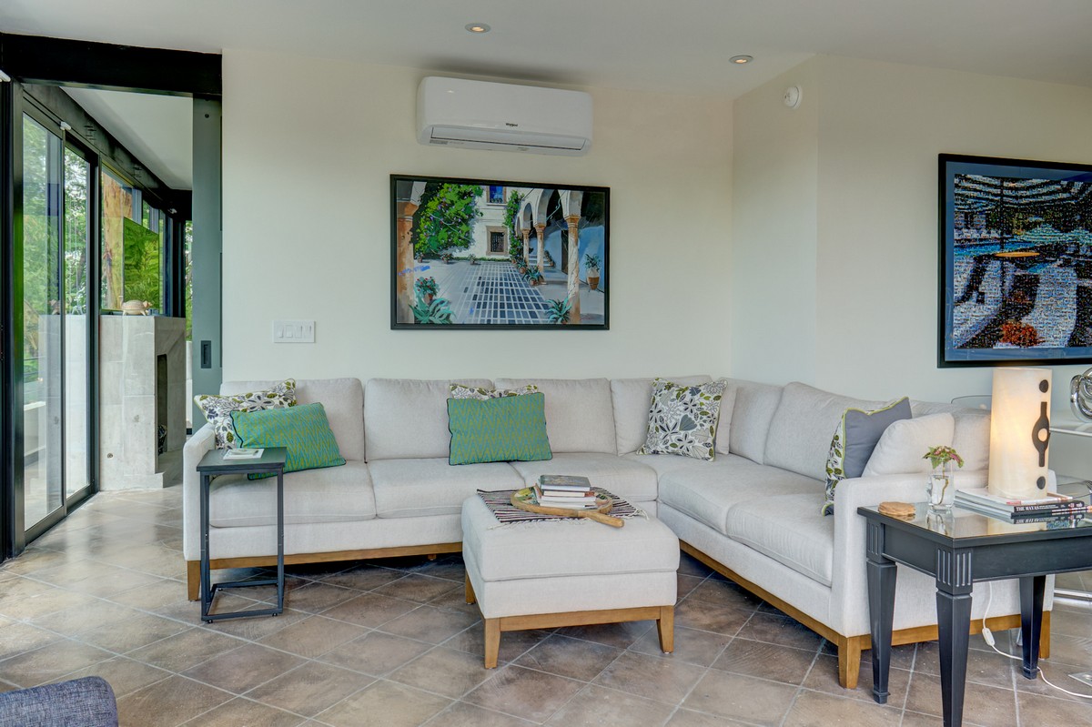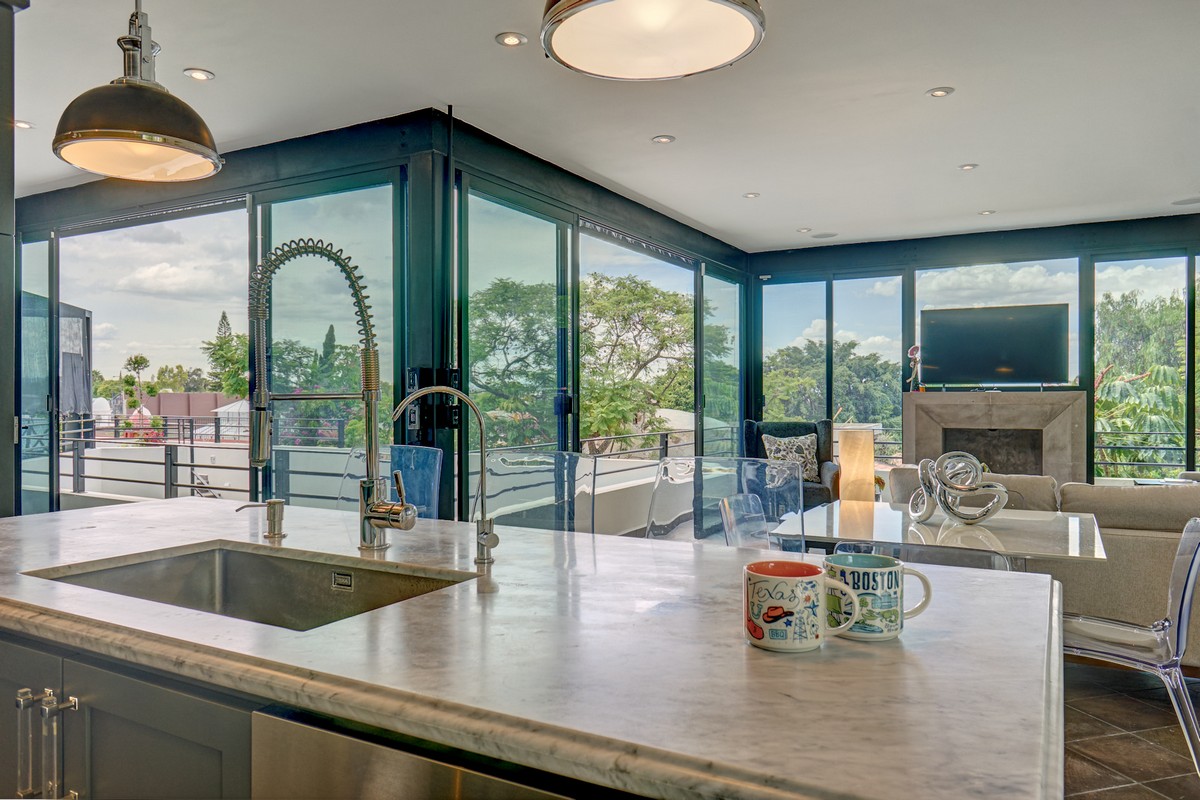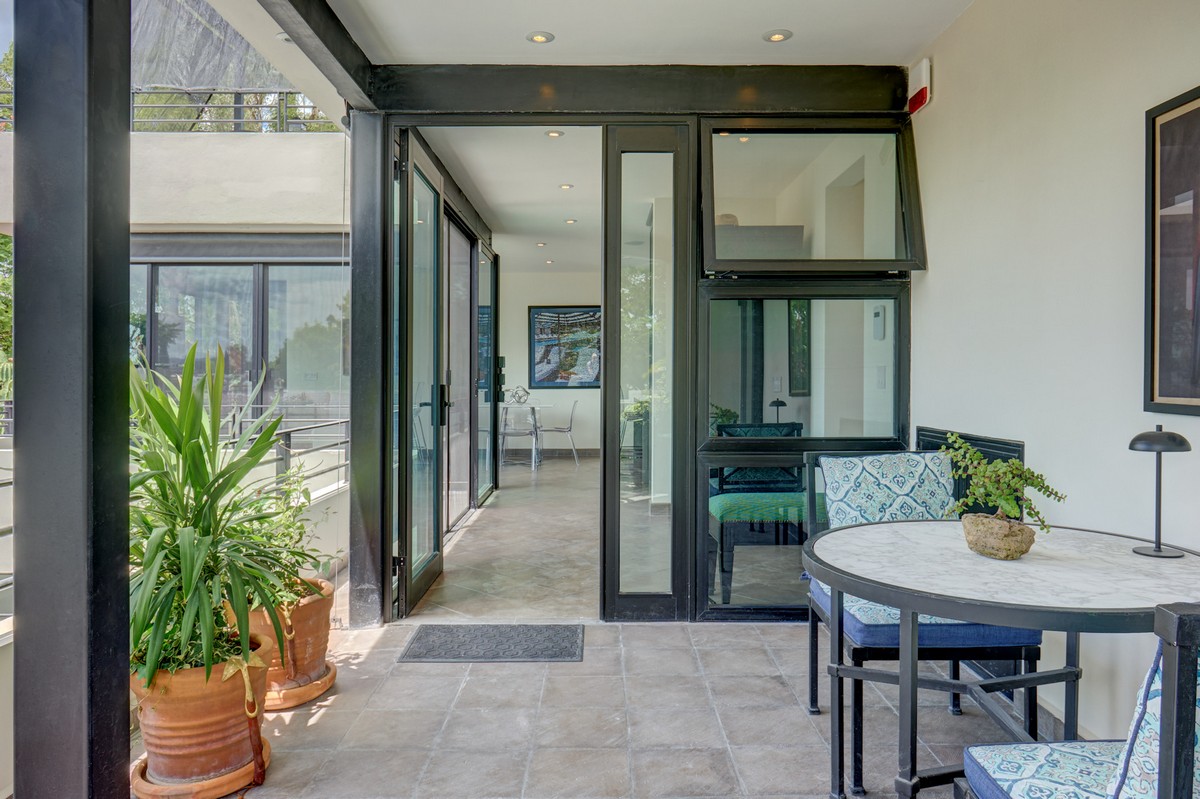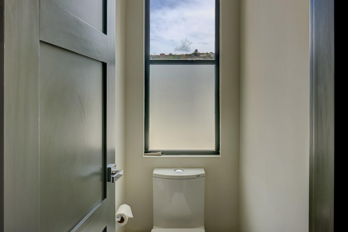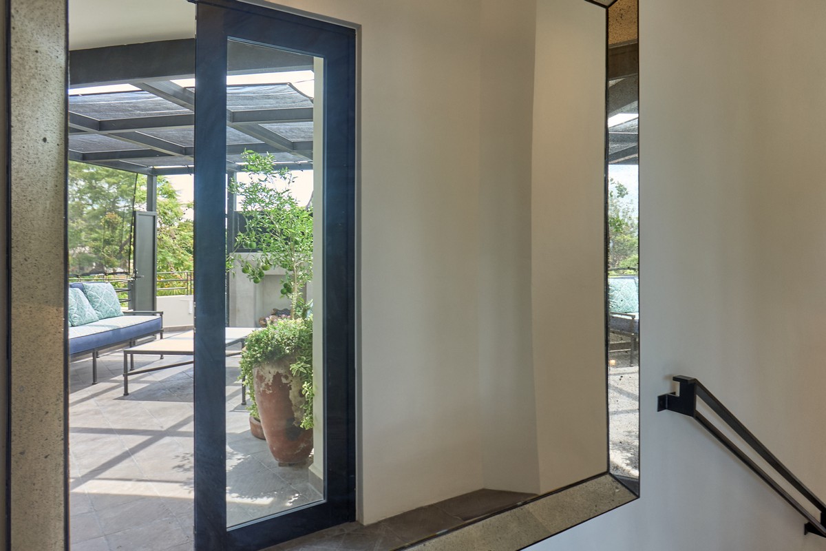 There is a guest half-bath off the large entry and an outdoor living room off the entrance to the flat. Most walls are glass for expansive views, but shades can be drawn with the push of a button. These shades are for sun protection and privacy, but only screen and not obscure the views.