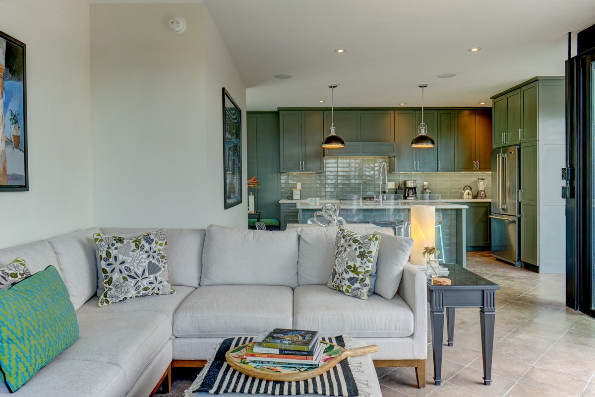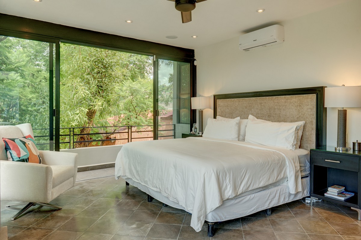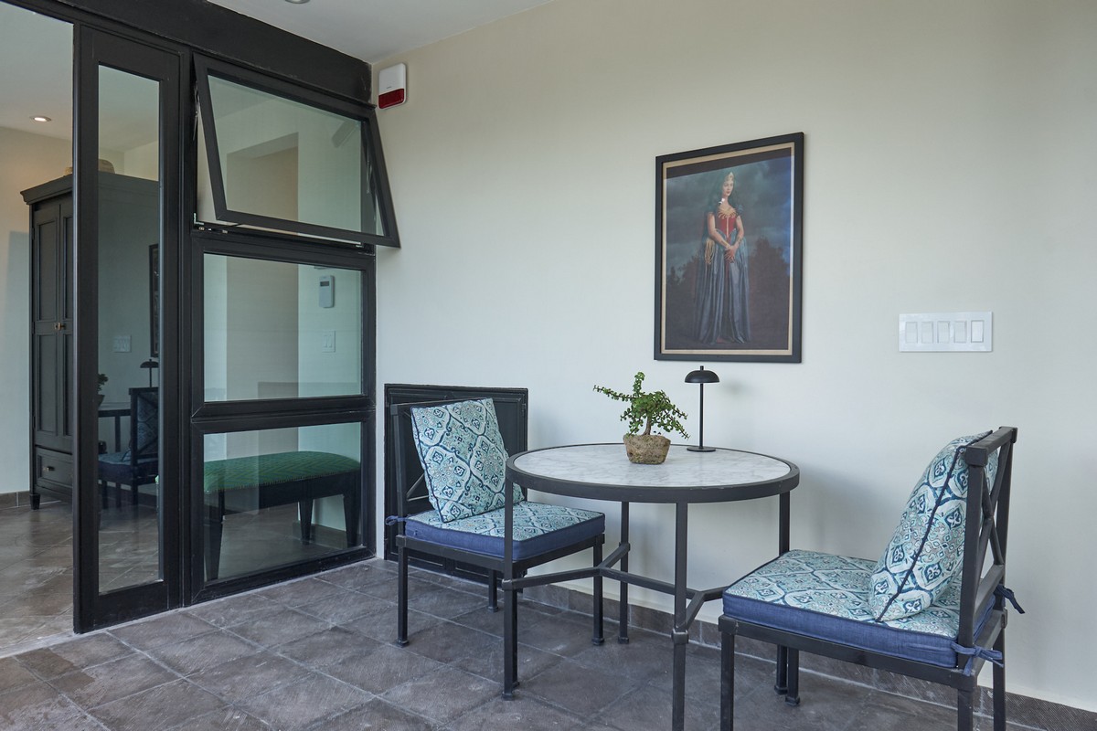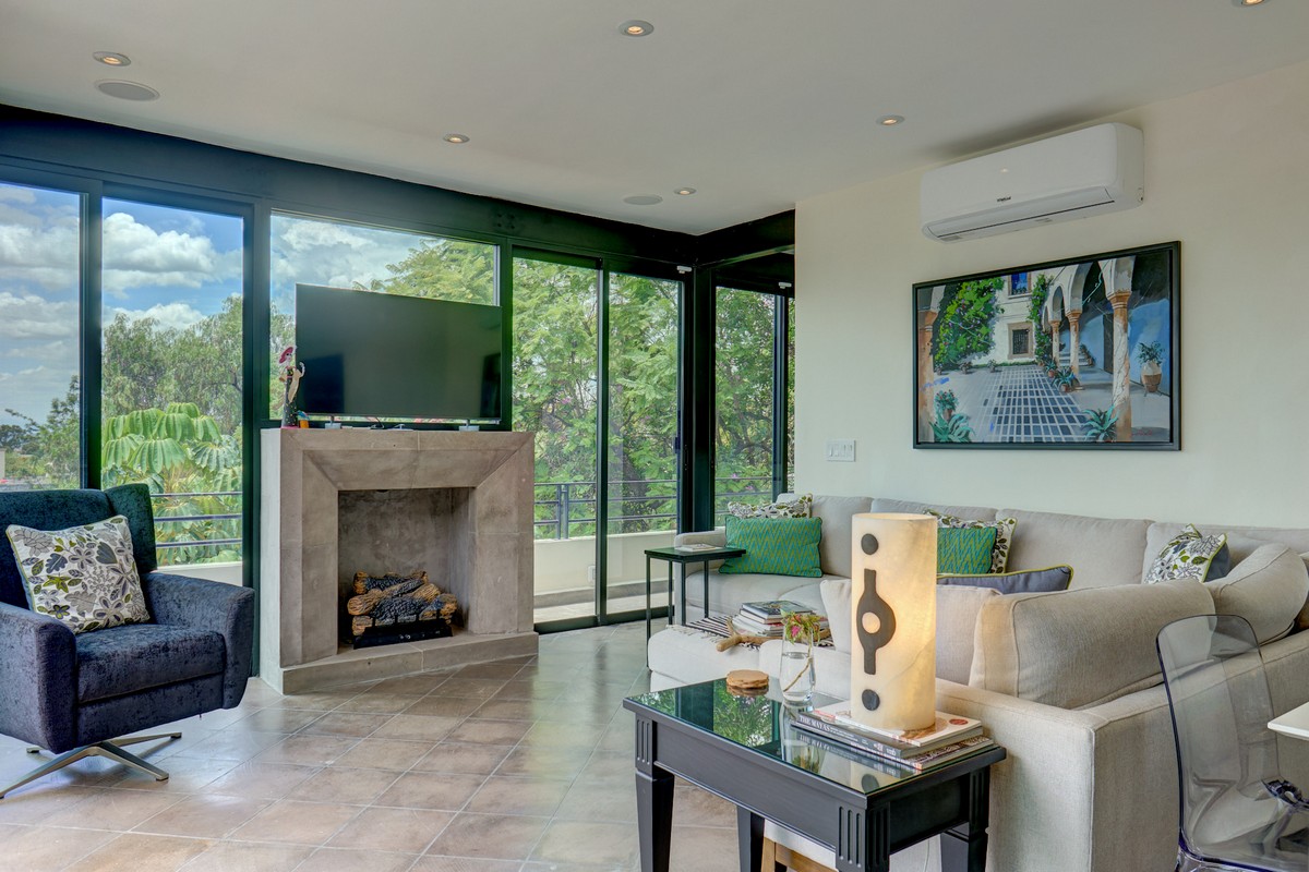 There is a guest half-bath off the large entry and an outdoor living room off the entrance to the flat. Most walls are glass for expansive views, but shades can be drawn with the push of a button. These shades are for sun protection and privacy, but only screen and not obscure the views.