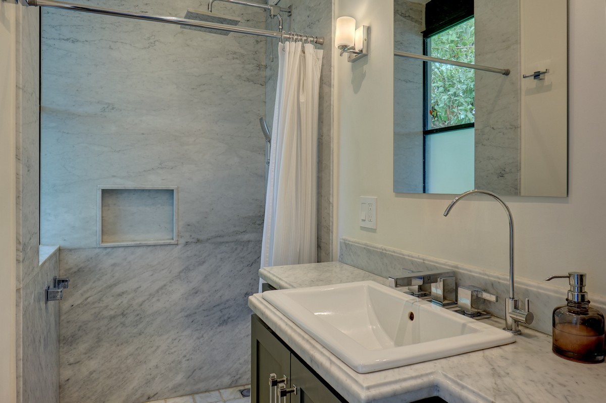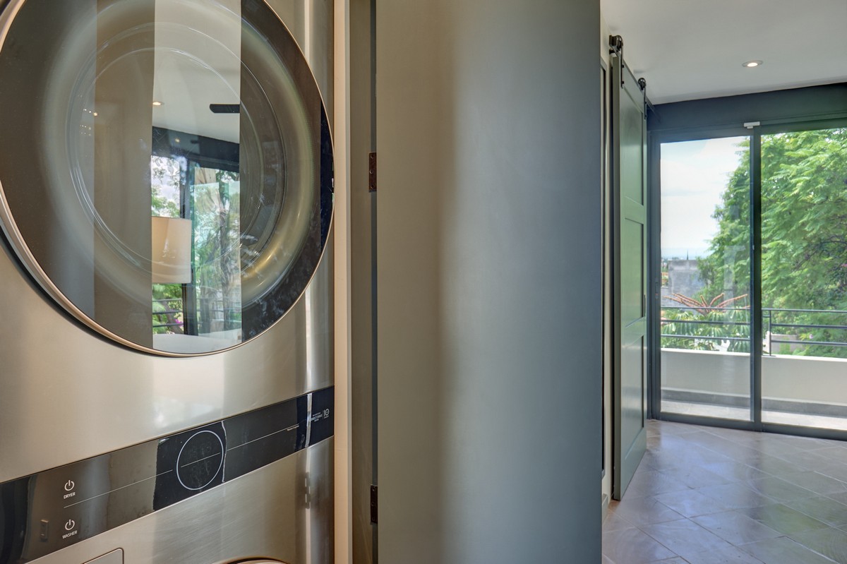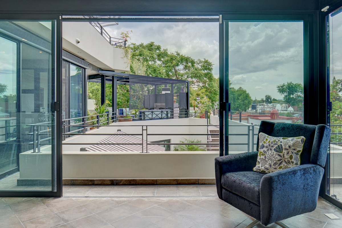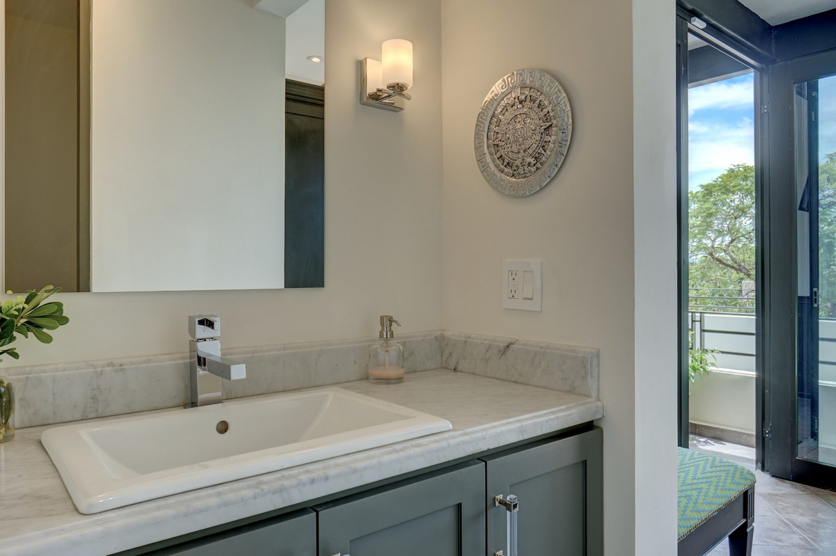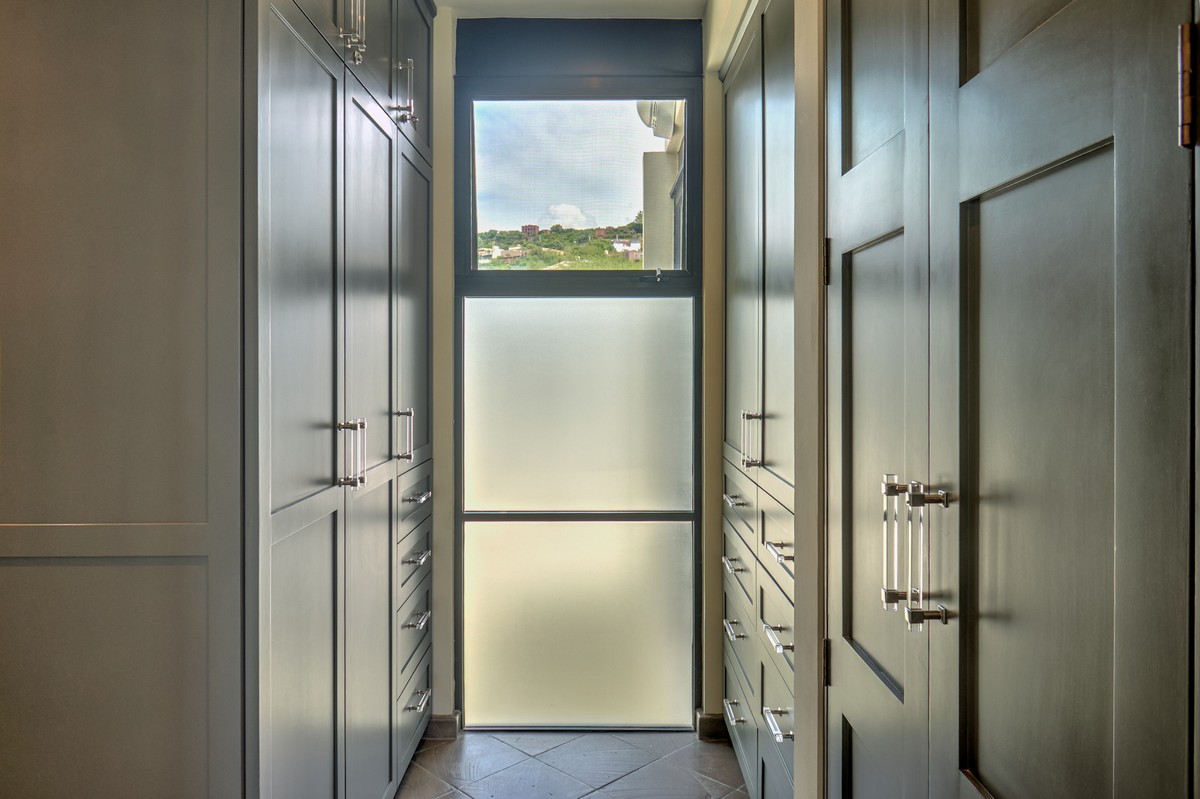 There is a guest half-bath off the large entry and an outdoor living room off the entrance to the flat. Most walls are glass for expansive views, but shades can be drawn with the push of a button. These shades are for sun protection and privacy, but only screen and not obscure the views.